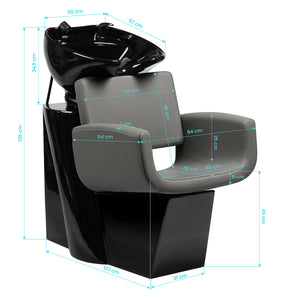 Die tiefe, keramische Schale in Schwarztönen reduziert das Spritzen von Wasser und Kosmetika, die während der Behandlungen verwendet werden. Durch den einstellbaren Neigungswinkel können Sie die Position an Ihre individuellen Bedürfnisse anpassen. Das strapazierfähige Material bietet Beständigkeit gegen Verfärbungen, Kratzer und Chemikalien, und die glatte Oberfläche macht es einfach, es sauber zu halten. Der ergonomisch geformte Kragen garantiert eine komfortable Kopfstütze.