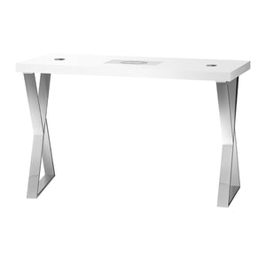 Die weiße Hochglanzplatte und die geometrischen, silberen Beine verleihen ihm Leichtigkeit und einen modernen Charakter. Dank seiner leichten Form eignet sich der Schreibtisch sowohl für intime als auch für geräumige Innenräume und unterstreicht deren exklusiven Charakter. Es ist eine hervorragende Investition in die Ästhetik und den Komfort der täglichen Arbeit.