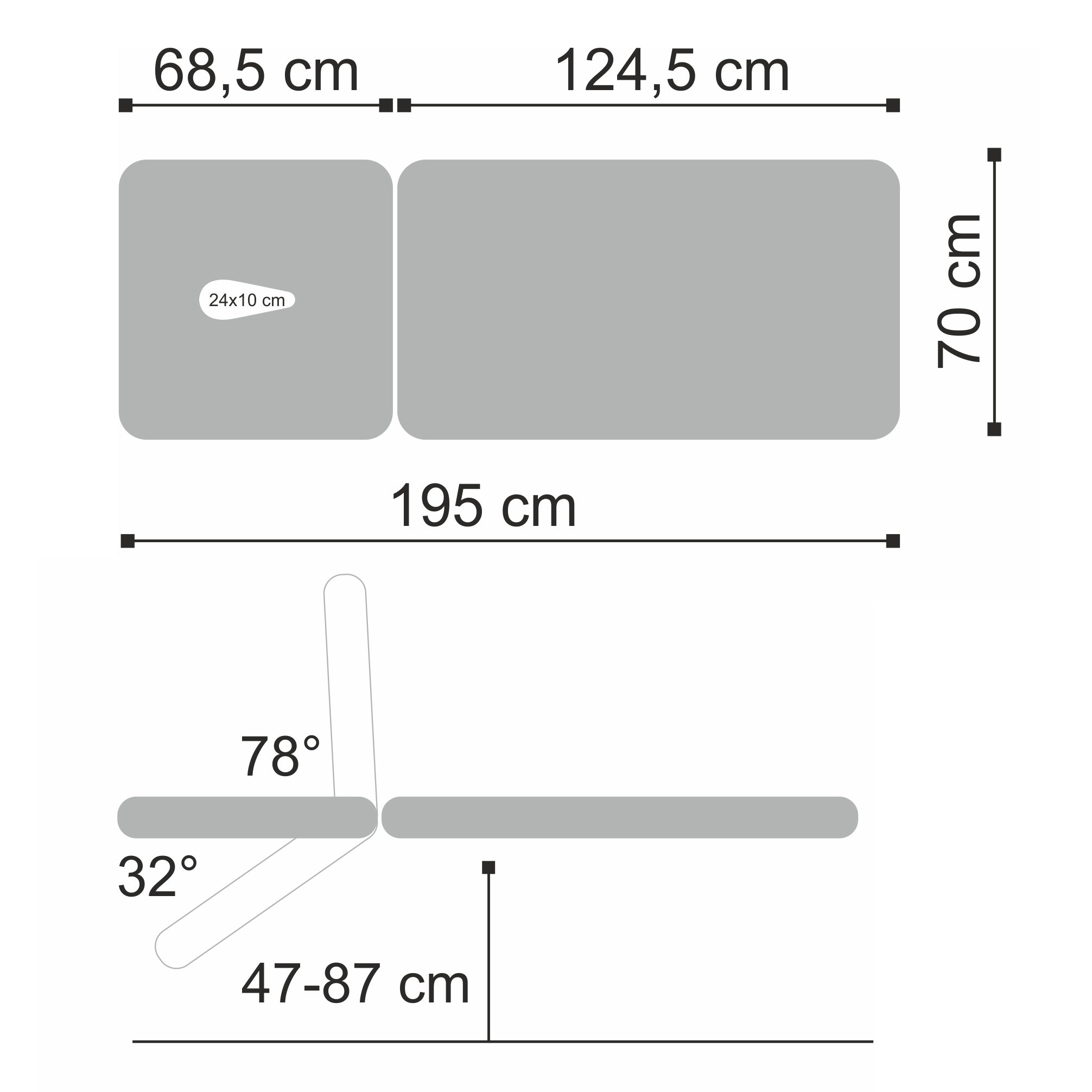 Two-segment tabletop: designed for universal application, the tabletop with dimensions of 195 x 70 cm, with an adjustable headrest, allows you to adjust the patient's position to various therapeutic procedures.
