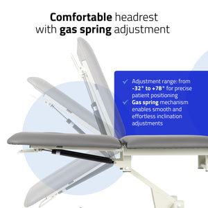 Adjustable headrest: the ability to adjust the angle of inclination with a gas spring from -32° to +78° allows for precise adjustment of the patient's position to the requirements of a given therapy.