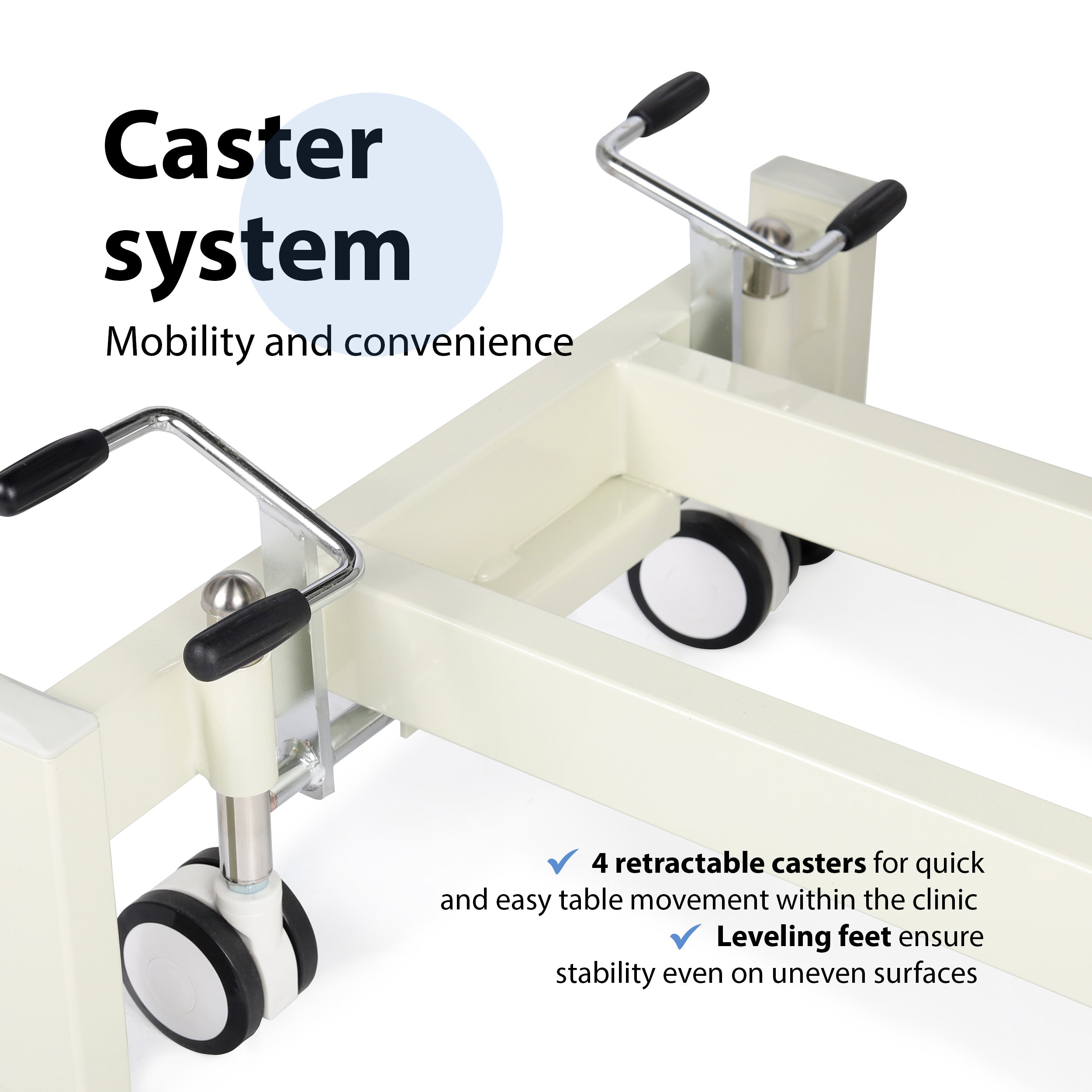Mobility: four medical-grade swivel castors and four large leveling feet facilitate table transport and guarantee stability even on uneven surfaces.