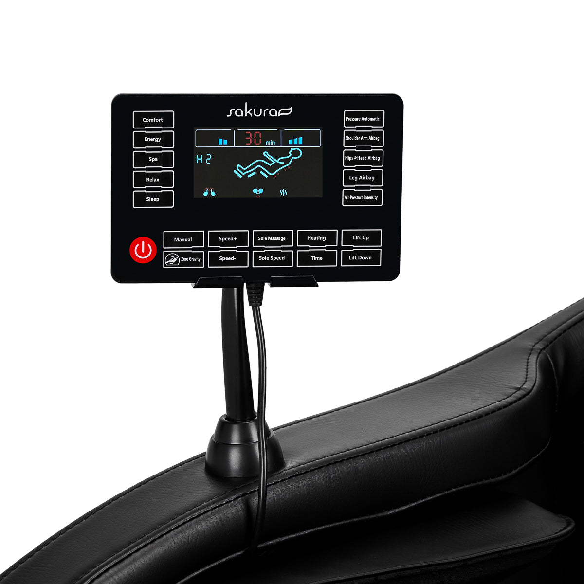 S prozirnom upravljačkom pločom – koja se može postaviti na ručku montiranu na desnom naslonu za ruku ili držati u rukama – korištenje fotelje je jednostavno i ugodno. Rad uređaja možete pratiti na jasnom LCD zaslonu. Jasno su prikazana područja tijela koja se trenutno masiraju, intenzitet tretmana, vrijeme usluge i odabrani program. Ploča vam omogućuje slobodno podešavanje postavki fotelje i funkcija masaže, kao i postavljanje trajanja tretmana, koje može trajati 5, 10, 15, 20, 25 ili 30 minuta.