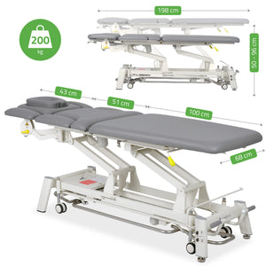 Két tanúsított elektromos működtetővel van felszerelve, amelyek sima, pontos és csendes magasságállítást biztosítanak 50 és 96 cm között. Ez kényelmet nyújt a terapeutának és a páciensnek egyaránt, lehetővé téve az asztal magasságának a munkatartáshoz való igazítását – védve a gerincét és növelve az ergonómiai hatékonyságot. Az alacsonyabb asztalpozíció megkönnyíti a páciensek biztonságos hozzáférését is.