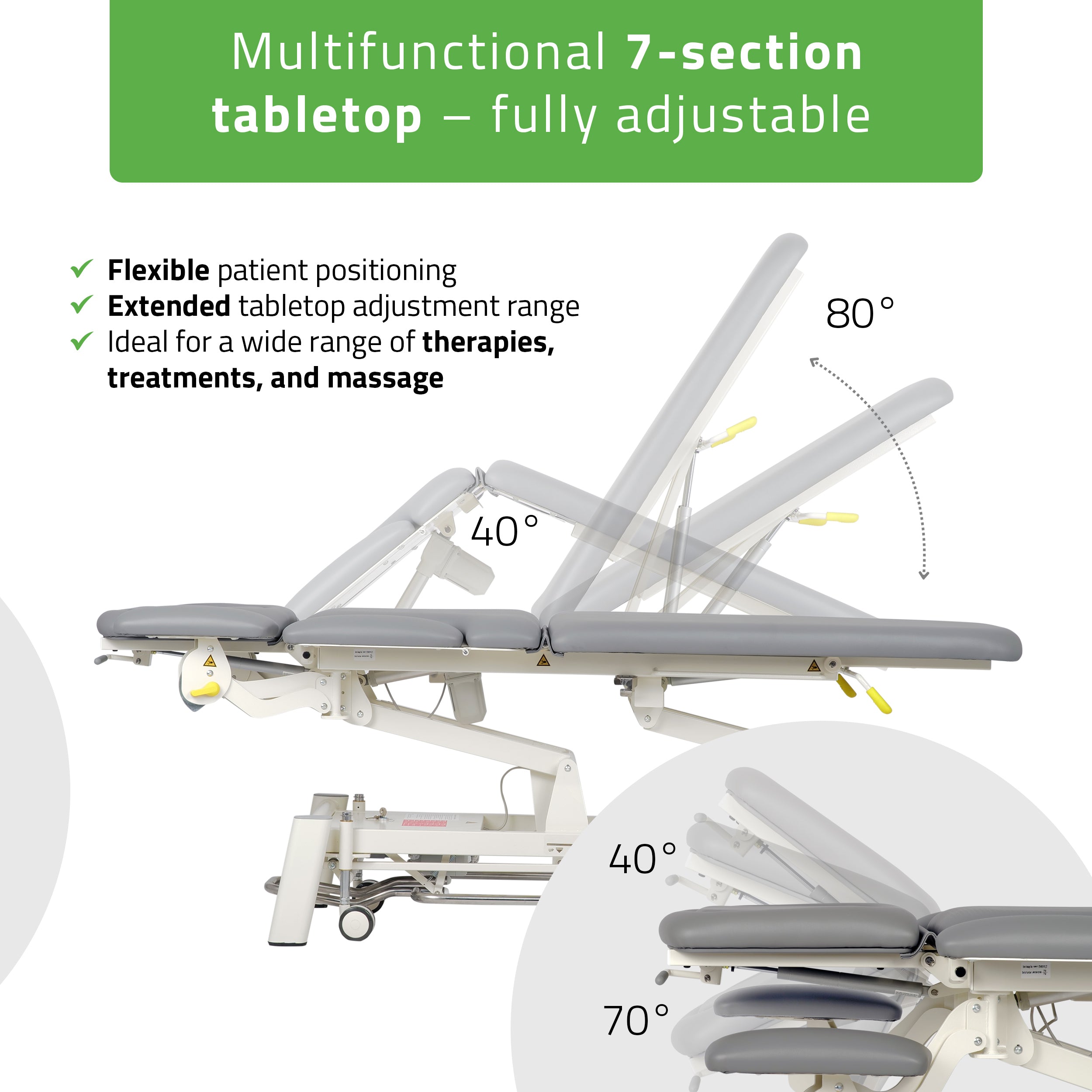 A PROXIMA X7 egy prémium kategóriás professzionális elektromos rehabilitációs asztal, amelyet intenzív használatra terveztek fizioterápiás klinikákon, rehabilitációs központokban és masszázsstúdiókban. A 7 szekciós asztallap, a fejlett elektromos beállítási funkciók és az ergonómiai megoldások biztosítják a biztonságot, a maximális pácienskomfortot és az optimális munkakörülményeket, amelyek a terapeuta egyéni igényeihez igazodnak.
