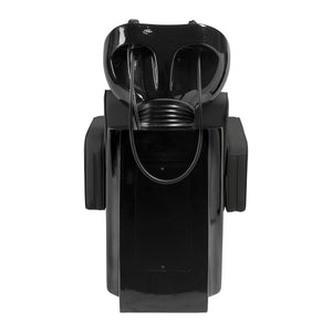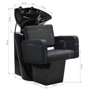 A fekete árnyalatú mély kerámia mosdótál minimalizálja a víz és a kozmetikumok fröccsenését a kezelések során. Az állítható mosdótál szög lehetővé teszi a pontos beállítást az ügyfél igényeihez. Tartós anyagból készült, ellenáll az elszíneződésnek, a karcolásoknak és a vegyszereknek, sima felülete pedig megkönnyíti a tisztán tartást. Az ergonómiailag profilozott gallér kényelmes fejtámaszt biztosít, míg a fekete műanyag borítás megszünteti a hideg érzetét a kerámia érintésekor.