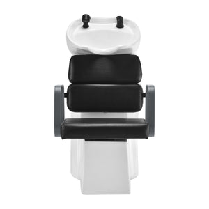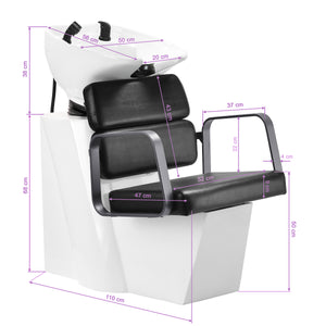 A fehér kerámia mosdókagyló megfelelő mélysége megakadályozza a víz vagy a kezelések során használt termékek túlzott fröccsenését. Ez lehetővé teszi a szolgáltatások széles skálájának kényelmes és hatékony elvégzését. A tál dőlésszöge állítható, így könnyen igazítható az egyéni igényekhez. A felhasznált anyagok magas minősége miatt a mosdókagyló tartós, ellenáll az elszíneződésnek és a karcolásoknak, és nagyon könnyen tisztítható. A megfelelően profilozott gallér és a döntött háttámla támaszt és kényelmet biztosít a hajmosás során, és a kényelmes fekete műanyag borításnak köszönhetően a vendég nem érzi a hideg kerámia felület kellemetlenségét.