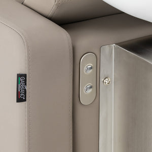 Az elektromos működtetővel állítható lábtartó ergonomikus pozíciót tesz lehetővé, amely az ügyfél igényeihez igazodik. Ez csökkenti az izomfeszültséget, ami kényelmet biztosít még hosszabb kezelések során is. A dőlésszöget a szék hátulján található gombokkal lehet szabályozni, felemelve vagy leengedve a lábtartót. Ez a megoldás nemcsak kivételes kényelmet, hanem magas funkcionalitást is biztosít, így a hajmosó egység tökéletesen megfelel a legigényesebb felhasználók elvárásainak is.