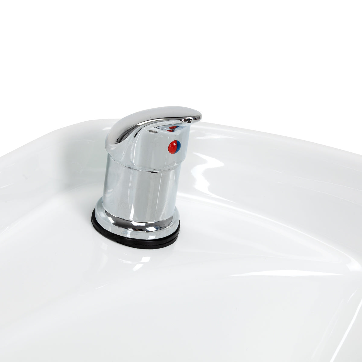 A fehér árnyalatú kerámia mosdókagyló mélysége lehetővé teszi a fodrászati szolgáltatások széles skálájának kényelmes és hatékony elvégzését, megakadályozva a víz és a kezelés során használt termékek túlzott fröccsenését. A felhasznált anyag miatt a mosdókagyló tartós, ellenáll az elszíneződésnek és a karcolásoknak, és nagyon könnyen tisztán tartható. A megfelelően profilozott gallér és a döntött háttámla támaszt és kényelmet biztosít hajmosás közben, és a fekete árnyalatú kényelmes műanyag borításnak köszönhetően az ügyfél nem fogja érezni a hideg kerámia felület okozta kellemetlenséget.