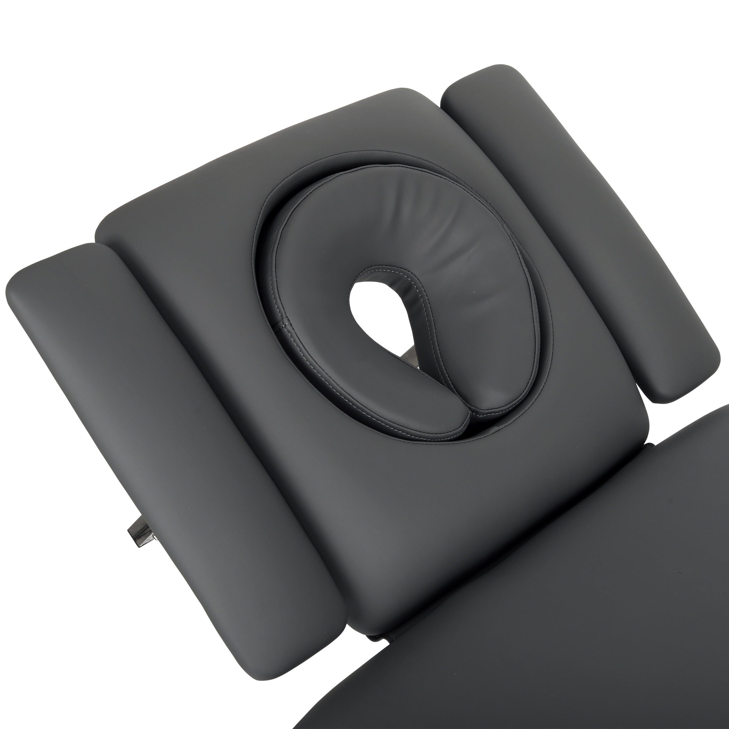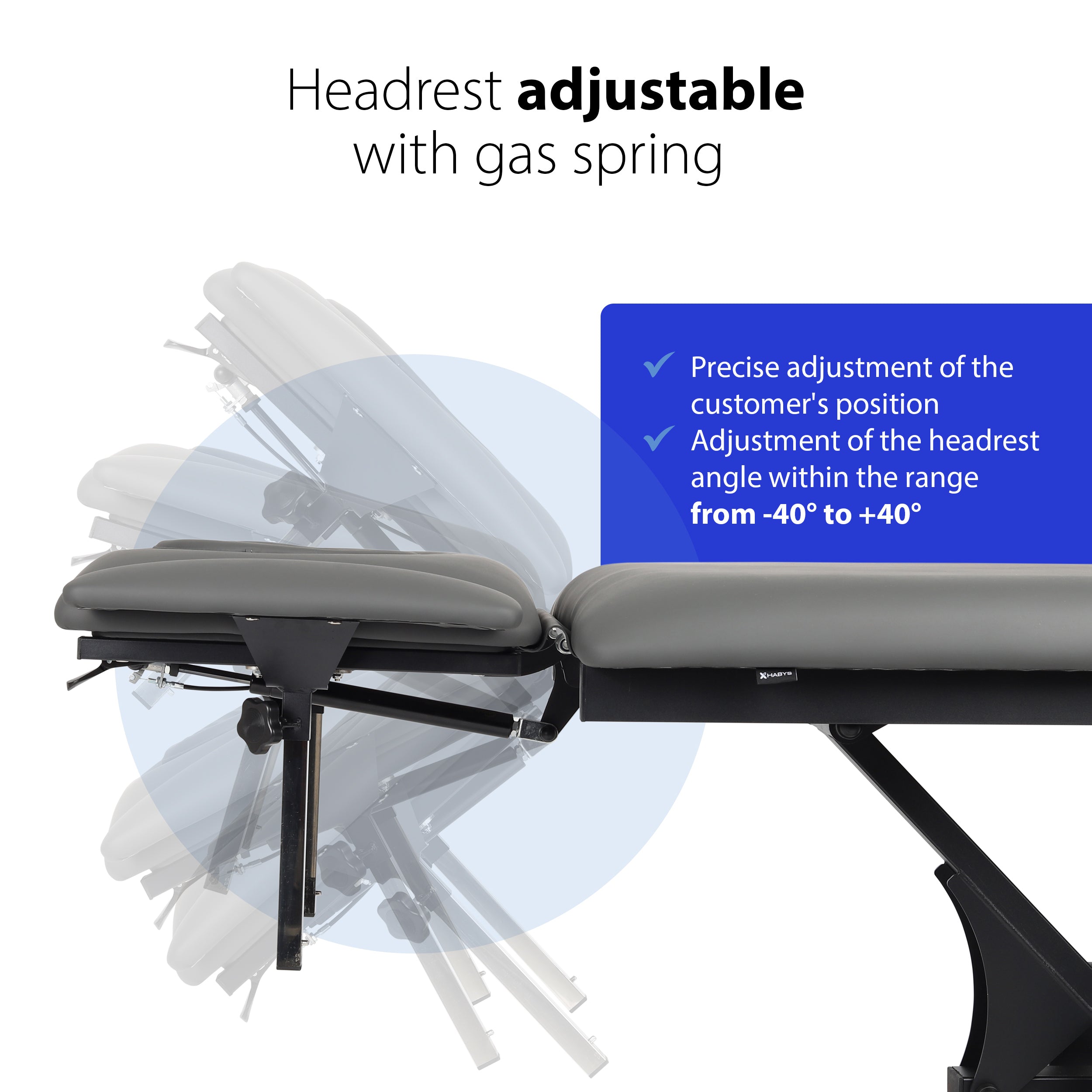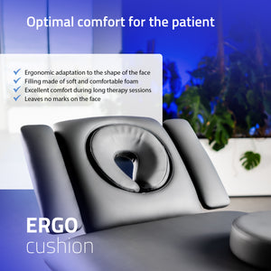 Headrest with ERGO cushion: The headrest's angle adjustment and gas spring mechanism ensure quiet and precise adjustment of the patient's position to the needs of the therapy. The Ergo cushion, appropriately soft and comfortable, specially contoured and adapted to the oval of the face, provides excellent comfort for the patient even during long therapy or massage sessions.