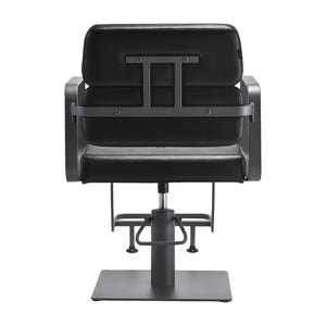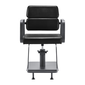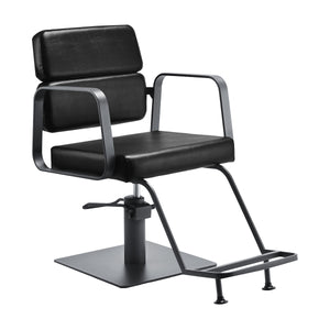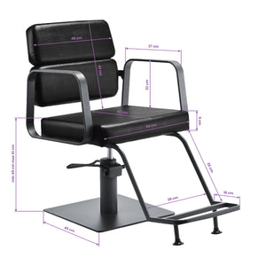 Der Volldrehmechanismus des Stuhls macht die Arbeit des Friseurs effektiver und komfortabler. Der stabile, flache, quadratische Sockel garantiert Stabilität während des Gebrauchs. Die matte, glatte Oberfläche verleiht dem Stück ein elegantes Aussehen und macht es leicht sauber zu halten. Ein bequemer Sitz mit Schaumstofffüllung sorgt für einen hohen Bedienkomfort, auch bei stundenlangen Behandlungen. Die geometrischen Armlehnen aus Metall ermöglichen die korrekte Positionierung der Schultern des Kunden – das bedeutet, dass er seinen Kopf nicht in den Schultern vergräbt oder gekrümmt ist – was präzise Behandlungen, einschließlich Haarschnitte, deutlich erleichtert. Eine stilvolle Fußstütze, die diesem Modell gewidmet ist, bietet stabilen Halt für die Füße des Benutzers.