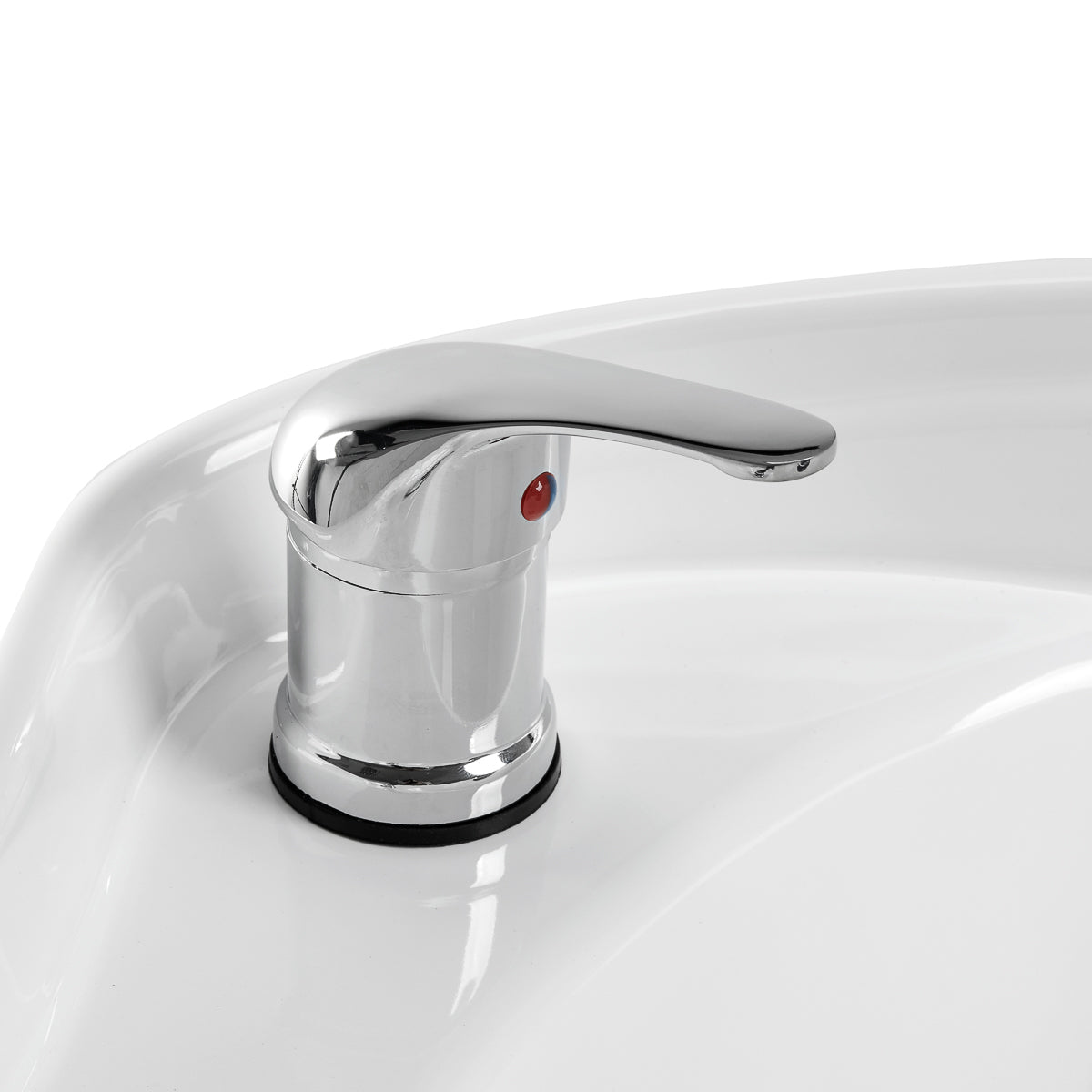 Die entsprechende Tiefe der Waschtischschale aus weißer Keramik verhindert ein übermäßiges Spritzen von Wasser und Produkten, die während der Behandlung verwendet werden. Somit ermöglicht es eine komfortable und effektive Durchführung einer breiten Palette von Dienstleistungen. Die bewegliche Natur der Schale ermöglicht es Ihnen, den Neigungswinkel leicht an Ihre individuellen Bedürfnisse anzupassen. Das verwendete Material macht das Waschbecken langlebig, resistent gegen Verfärbungen und Kratzer und sehr leicht sauber zu halten. Ein richtig profilierter Kragen bietet optimalen Halt und Komfort beim Haarewaschen, und eine bequeme Kunststoffauflage in Schwarztönen sorgt dafür, dass der Kunde keine Unannehmlichkeiten im Zusammenhang mit der Kälte der Keramikoberfläche verspürt.