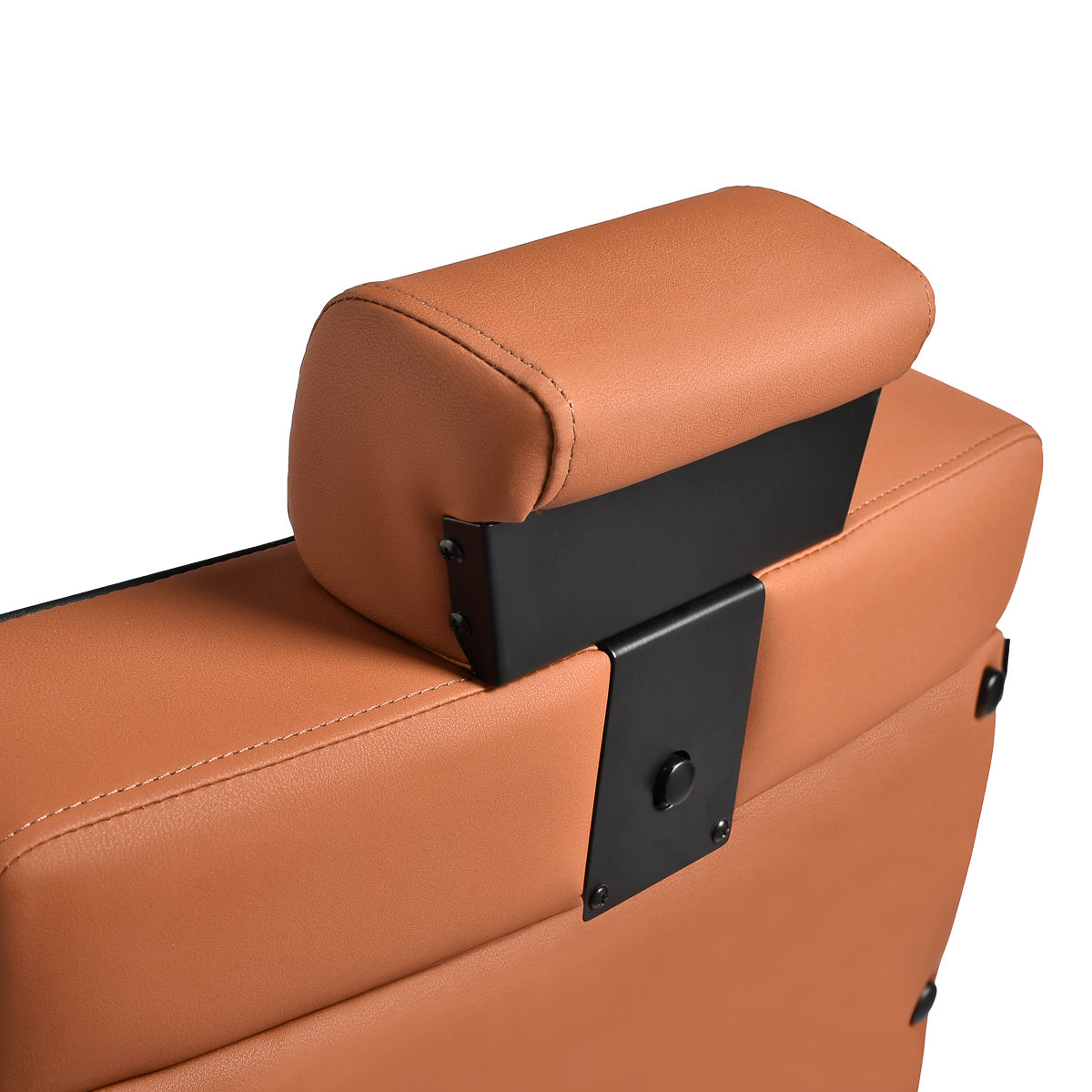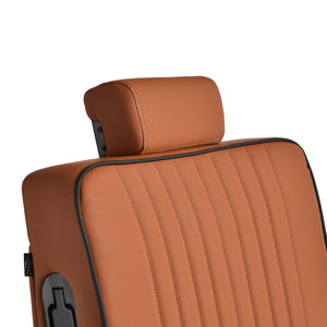 Der schwarze, runde Boden sorgt für Stabilität und Langlebigkeit. Die Polsterung besteht aus weichem, mattem Kunstleder, das Komfort mit Langlebigkeit verbindet. Die verwendeten Materialien sind feuchtigkeitsbeständig, langlebig und leicht zu reinigen. Stilvolle Nähte und Polsterungen in Brauntönen verleihen ihm einen einzigartigen Charakter, der perfekt zum Dekor moderner Friseursalons passt. Die Kombination des eleganten Farbtons der Polsterung mit dem schwarzen Gestell und Untergestell unterstreicht den modernen, professionellen Look des Sessels.