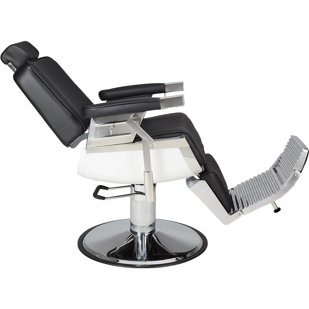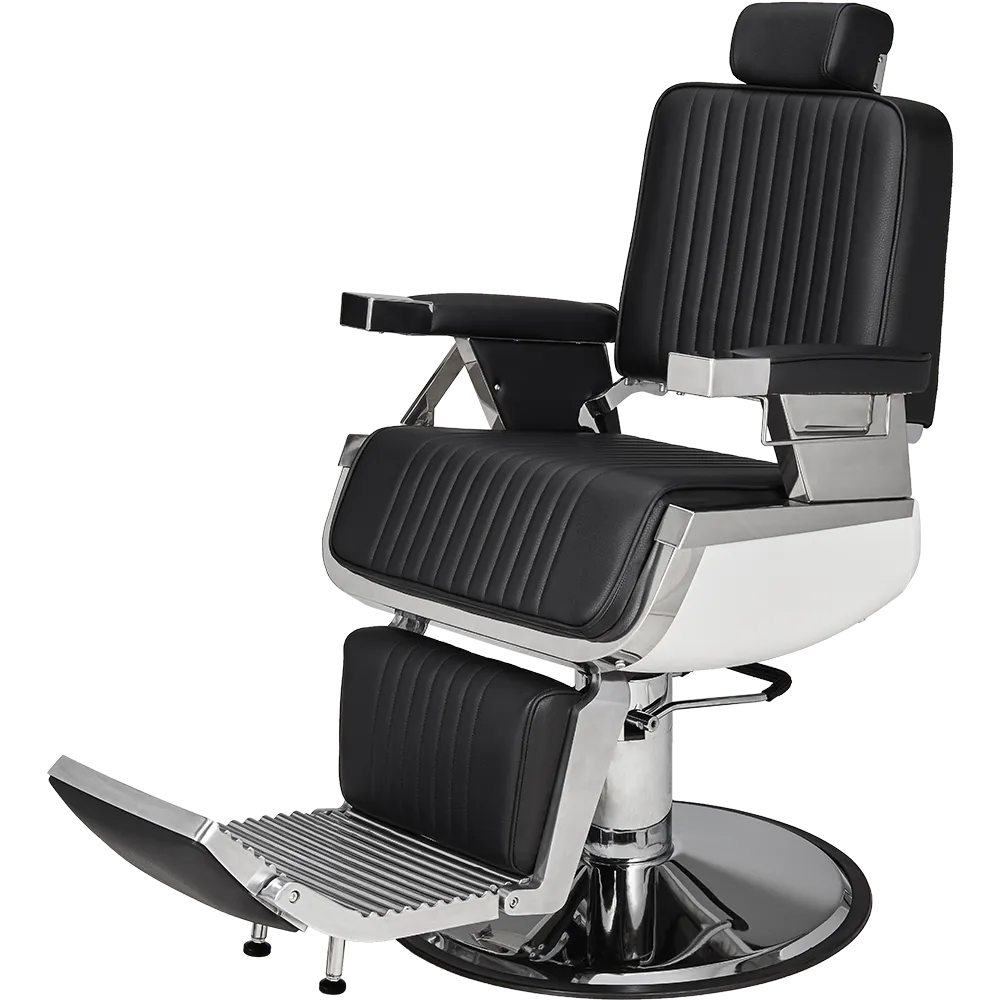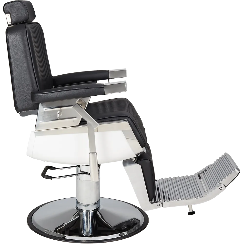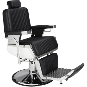 An elegant chair for the modern barbershop. The white seat casing combined with a sleek chrome base creates an impression of lightness, while the vertical stitching on the black upholstery adds a touch of class. Black upholstery