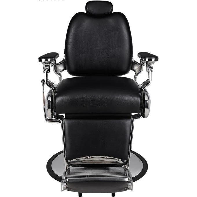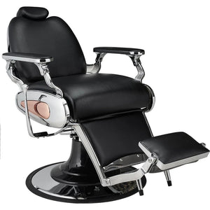 A barbershop classic with a chrome-plated frame and copper details on the sides of the seat. Smooth black upholstery and an upholstered swivel footrest add comfort, while the black pump cover completes the elegant look. Black upholstery