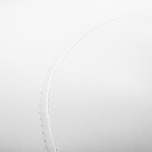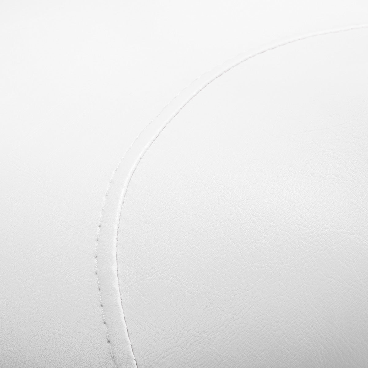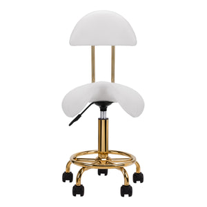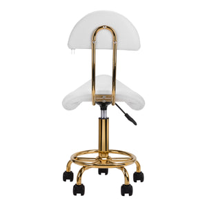 Bequemer, stabiler Kosmetikhocker mit Rückenlehne, mit profiliertem Sitz, Metallelementen in Goldfarbe. Auf einem Fünf-Speichen-Sockel mit Kunststoffrädern. Erhältlich in Weiß, ein unverzichtbares Möbelstück im Schönheitssalon.