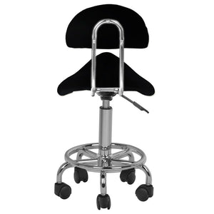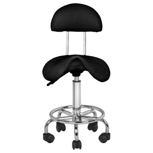 Ein bequemer, stabiler Kosmetikhocker mit einer Rückenlehne und einem gut geformten Sitz verfügt über ein 5-armiges Gestell und Kunststoffräder. Er ist in Schwarz erhältlich. Er ist ein unentbehrliches Möbelstuck im Schönheitssalon.