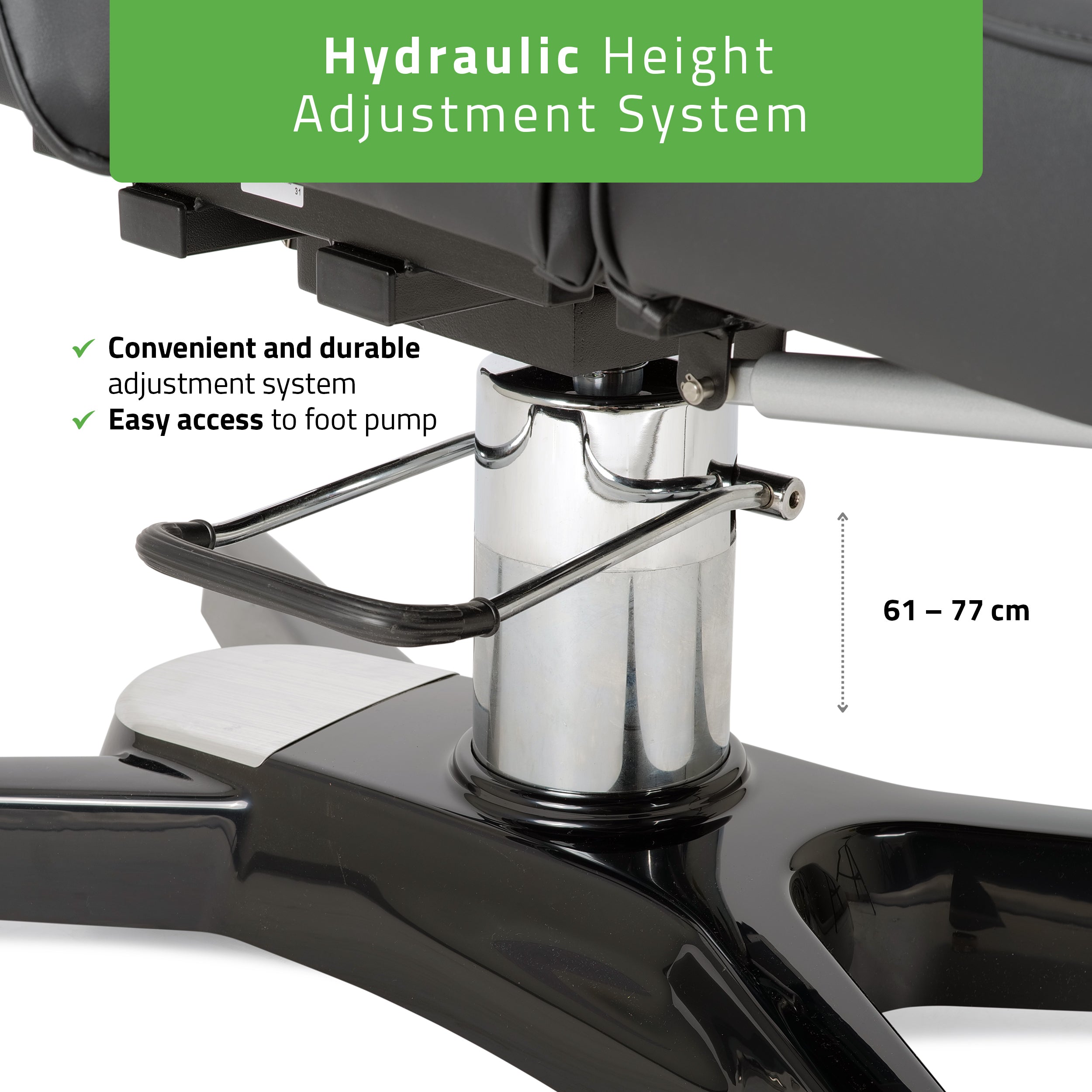 Height adjustment by hydraulic foot pump from 61 to 77 cm: smooth and stable adjustment without effort.