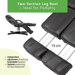 Extendable leg sections with separate adjustment for each section: ideal for podiatry treatments, enabling one leg to be raised independently.