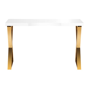 Die weiße Hochglanzplatte und die geometrischen, goldenen Beine verleihen ihm Leichtigkeit und einen modernen Charakter. Dank seiner leichten Form eignet sich der Schreibtisch sowohl für intime als auch für geräumige Innenräume und unterstreicht deren exklusiven Charakter. Es ist eine hervorragende Investition in die Ästhetik und den Komfort der täglichen Arbeit.