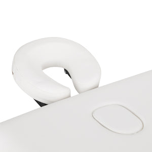 Kako bi se osigurala maksimalna udobnost, osoba koja koristi stol može nasloniti glavu na ergonomski naslon za glavu, koji je uključen u set. Ovaj element je jednostavan za podešavanje – omogućuje podešavanje kuta u dvije ravnine, što omogućuje precizno prilagođavanje njegovog položaja potrebama korisnika i prirodi tretmana koji se izvodi. Za terapiju u ležećem položaju, naslon za glavu se može ukloniti, koristeći umjesto toga poseban otvor u ploči stola. Kada se ne koristi, otvor se može pokriti priloženim čepom, vraćajući površini estetski i ujednačen izgled.