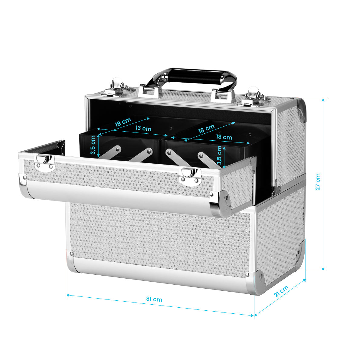 Moderan dizajn u nijansama srebra s naglascima sjaja dodaje elegantan dodir. Ručka olakšava transport, što je posebno važno za mobilne stiliste. Izrađena od izdržljivih materijala otpornih na oštećenja, osigurava udobnost svakodnevne upotrebe. Čvrsto zatvaranje s ključem osigurava zaštitu sadržaja, a lagana, izdržljiva konstrukcija čini torbu lakom za nošenje.