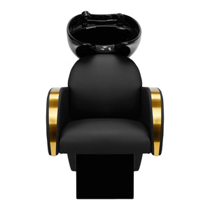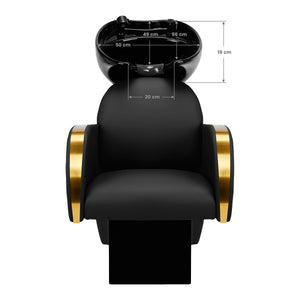 Pravilno profilirana stolica ispunjena izdržljivom pjenom osigurava visoku udobnost korištenja, a elegantni nasloni za ruke omogućuju pravilno pozicioniranje ramena klijenta. Naslon je postavljen pod optimalnim kutom kako bi omogućio zauzimanje pravog položaja i promicao izvrsnu potporu kralježnici. Presvlaka u crnim nijansama i dekorativne metalne površine lakirane u zlatnim bojama daju joj bezvremensku eleganciju te dodatno jamče dugotrajnu izdržljivost i lakoću čišćenja. Prepoznatljiva klasična završna obrada praonice za kosu čini da izgleda sjajno u gotovo svakom prostoru. Set uključuje kompletnu armaturu u crnim nijansama, uključujući slavinu, tuš glavu i namjenska crijeva za pružanje kompletnog seta alata za rad.