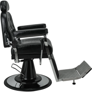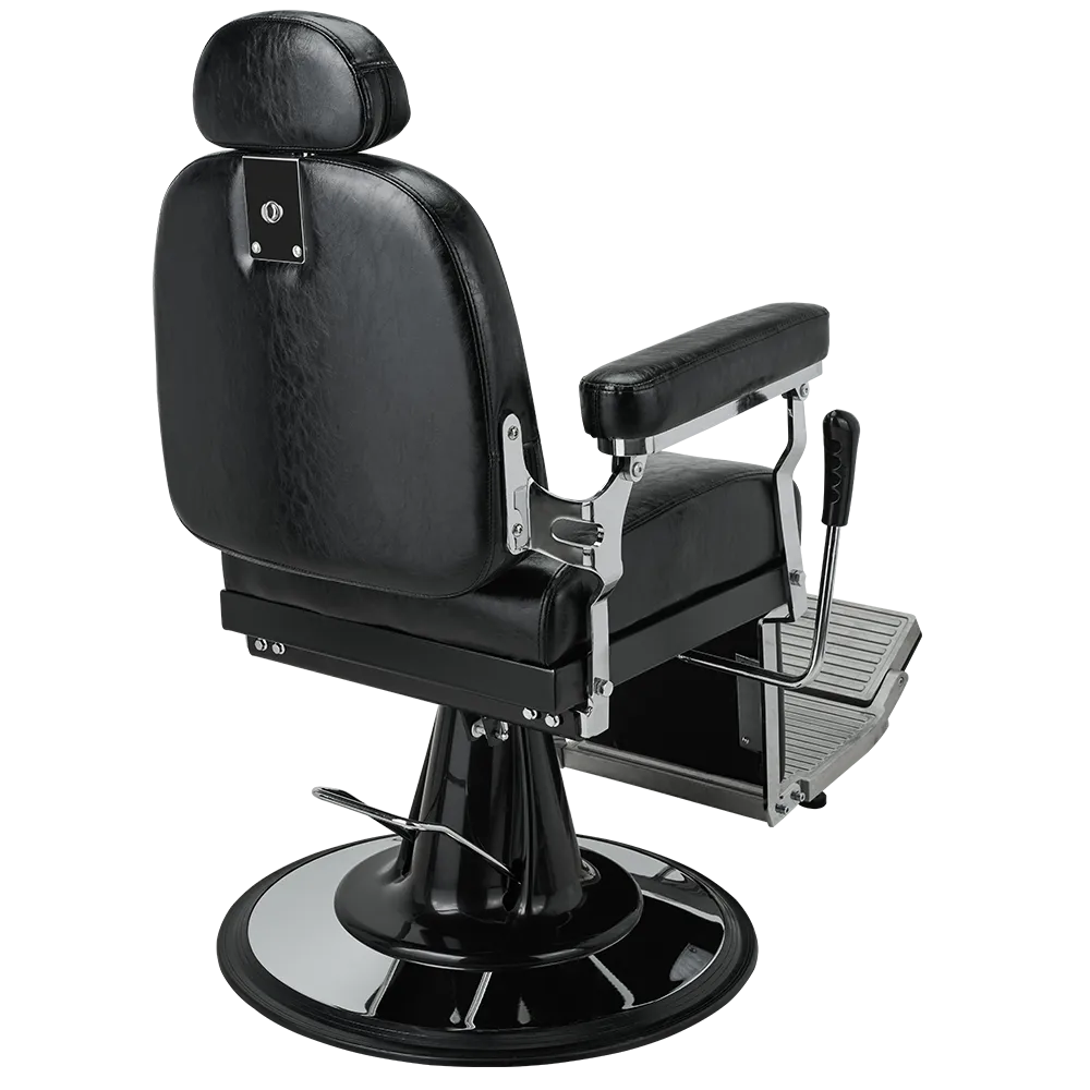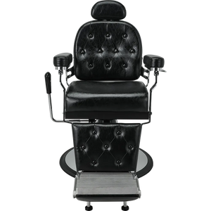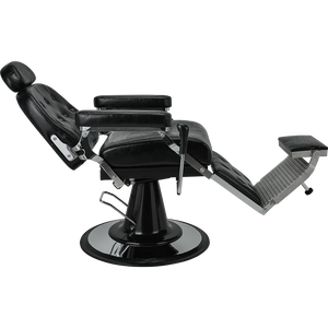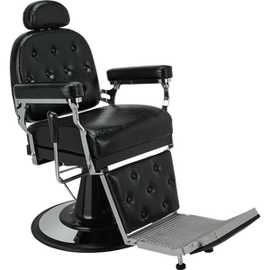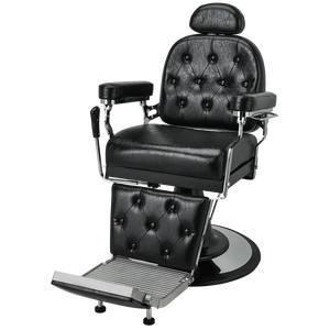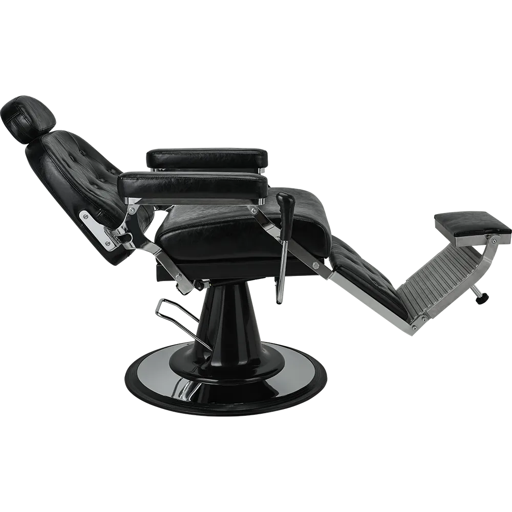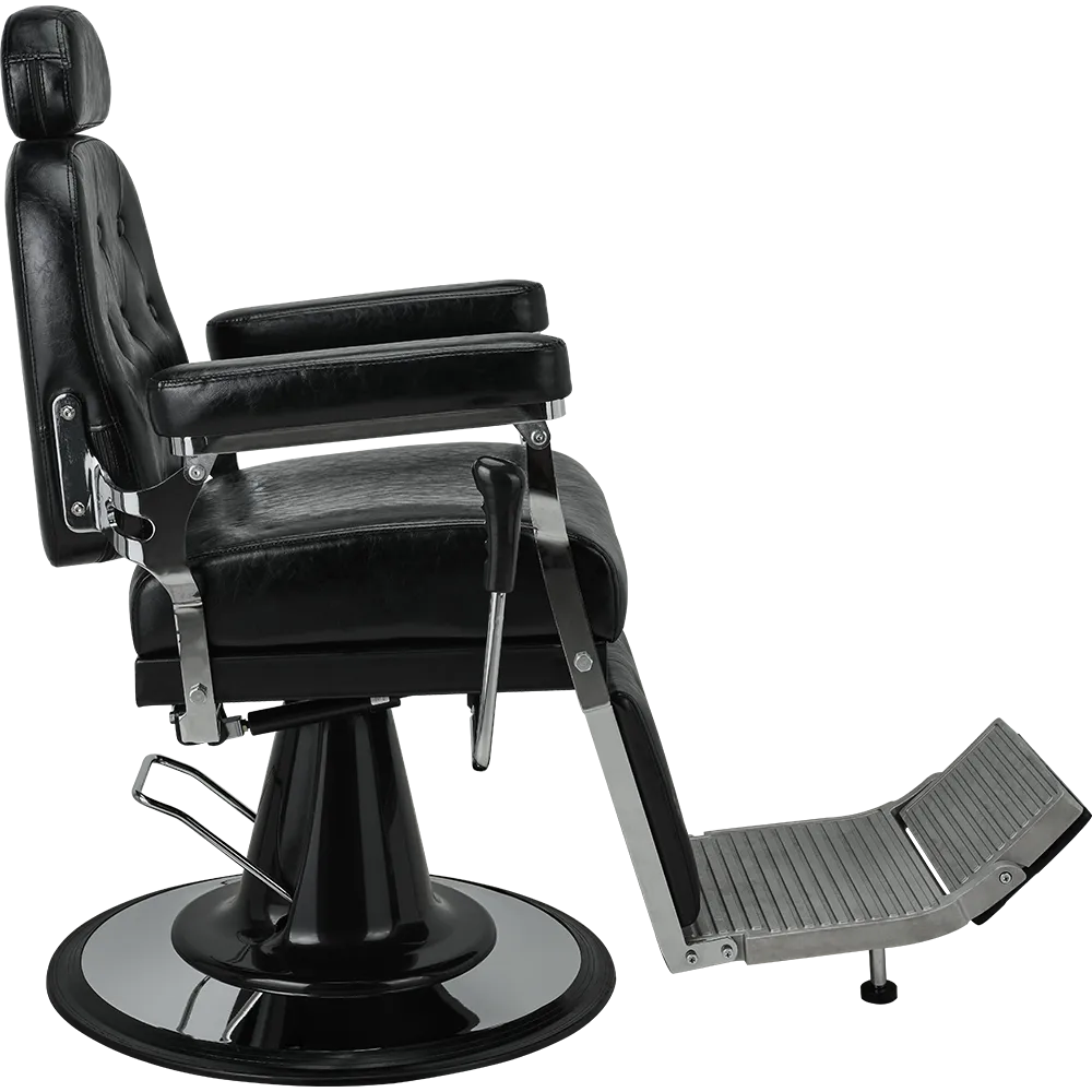 A classic barber chair with glossy black upholstery, featuring a button-tufted backrest and legrest. The adjustable headrest and reclining function ensure maximum comfort at work. Black upholstery