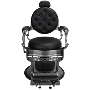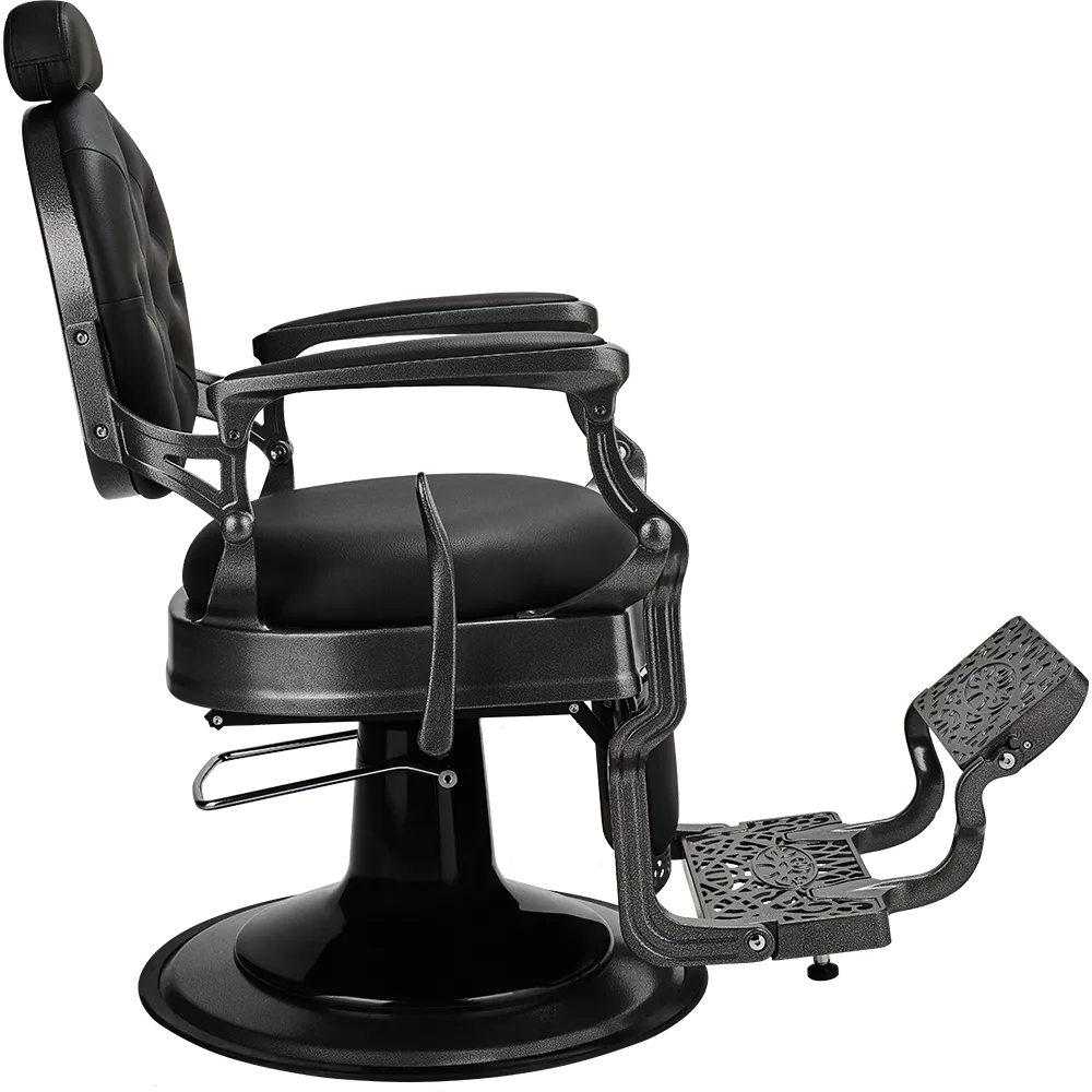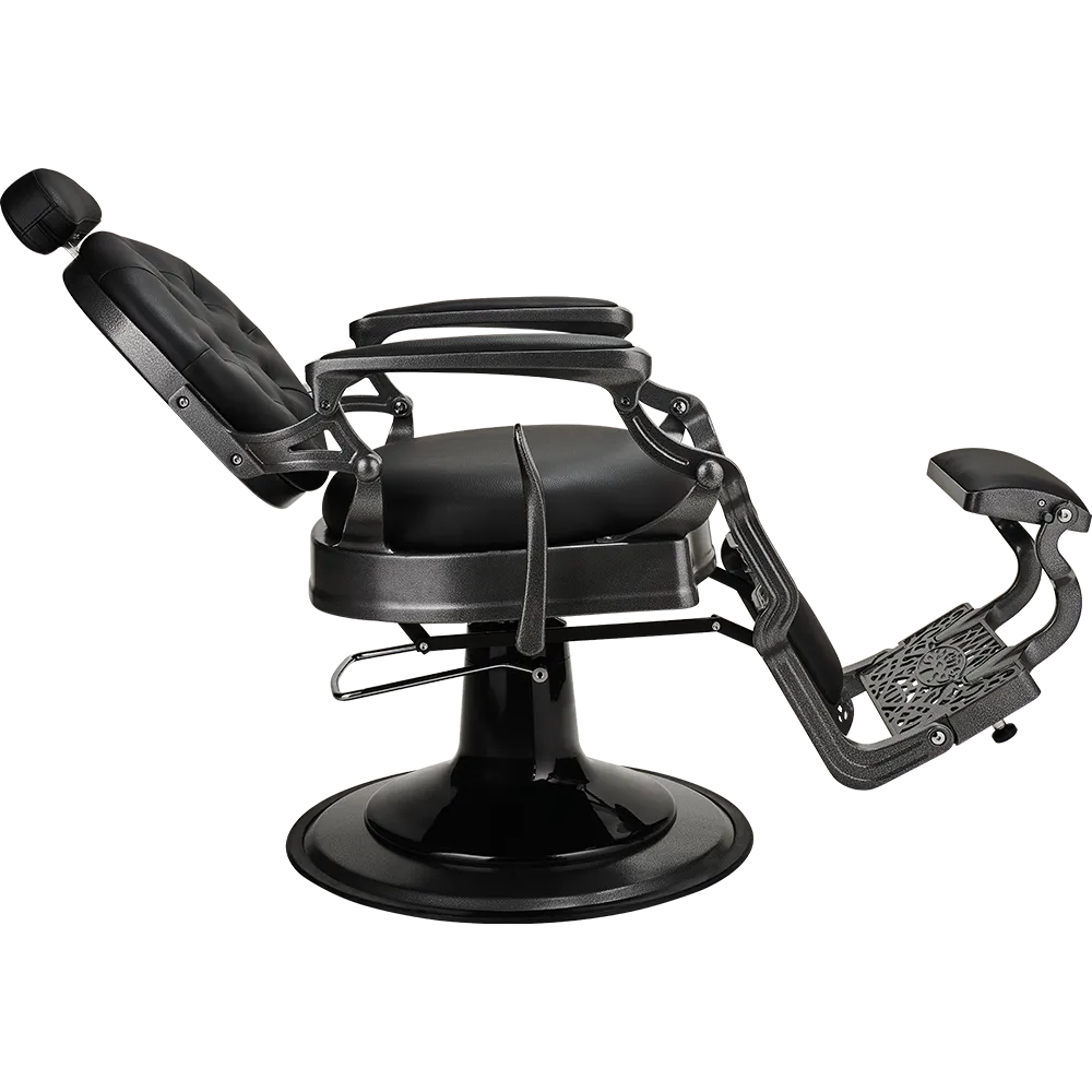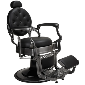 The perfect chair for vintage barbershops. The backrest is padded with buttons, while the elegant black upholstery pairs beautifully with the matte dark metal decorative frame. Black upholstery