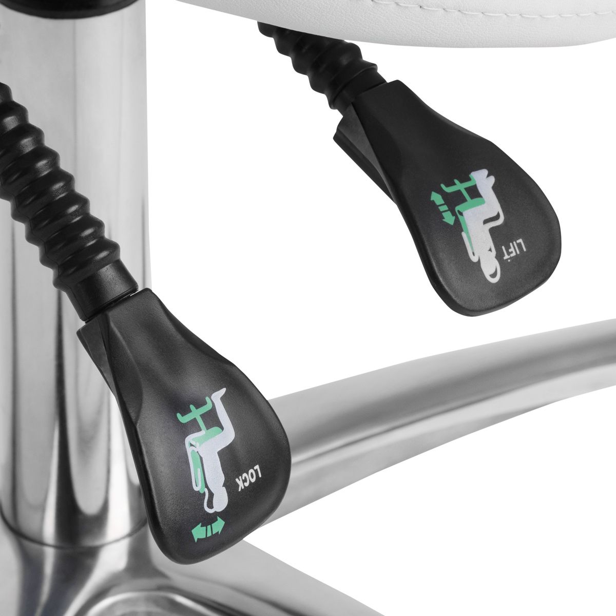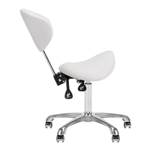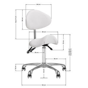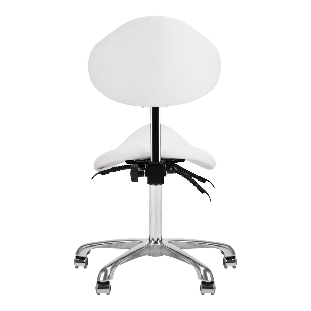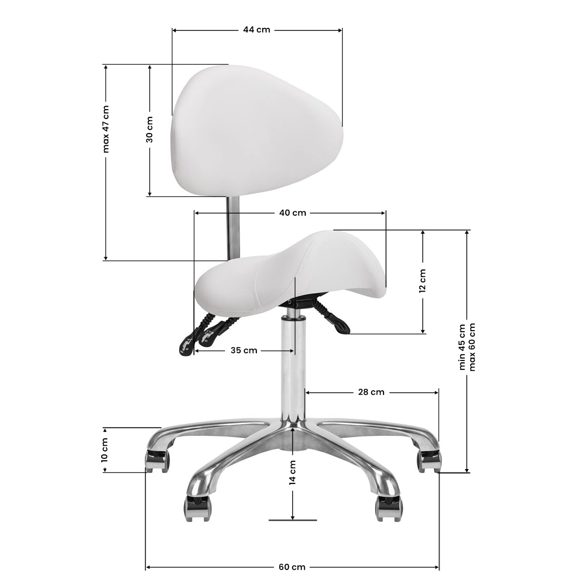 Udobna, ekskluzivna, stabilna kozmetička stolica s naslonom i profiliranim sjedalom, na bazi s pet zvjezdica, vrlo stabilna. Podesiva u tri ravnine: