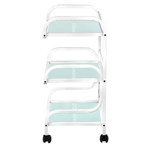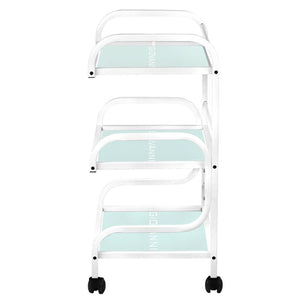 estetski stol za kozmetičke uređaje, izrađen od metala i stakla, s kotačima. ima tri staklene police s ugraviranim logotipom giovanni.