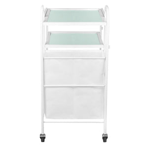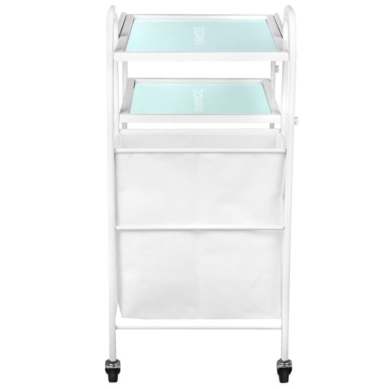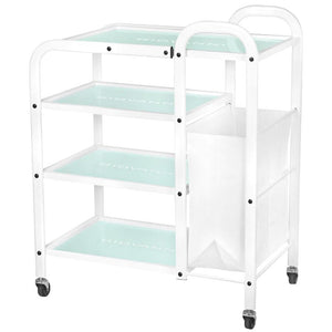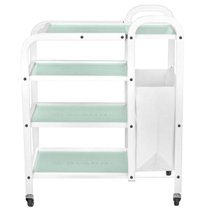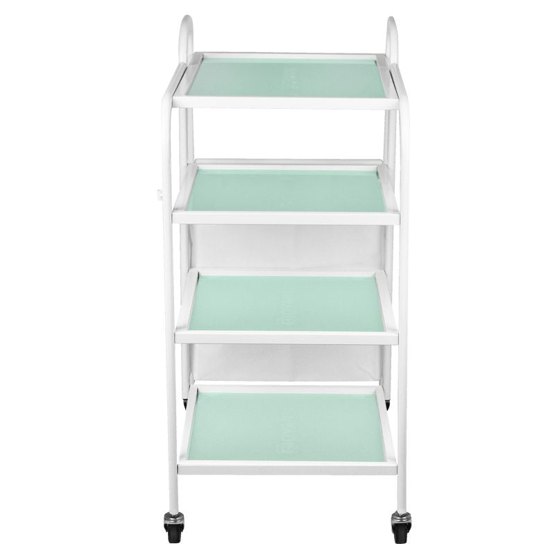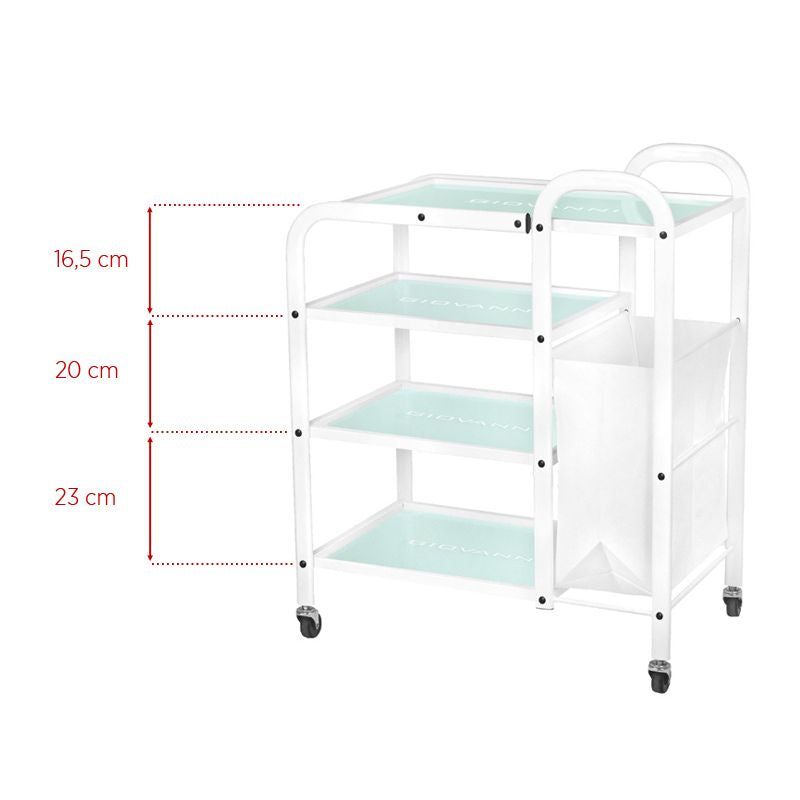 funkcionalni metalni i stakleni stol na gumenim kotačima. stol ima četiri staklene police s ugraviranim logotipom giovanni. dodatna prednost stola je torba za prljave ručnike i kozmetičke trake pričvršćene na njega.