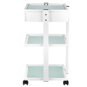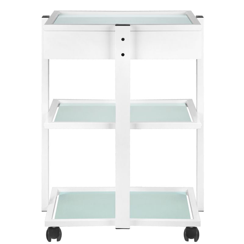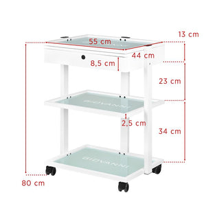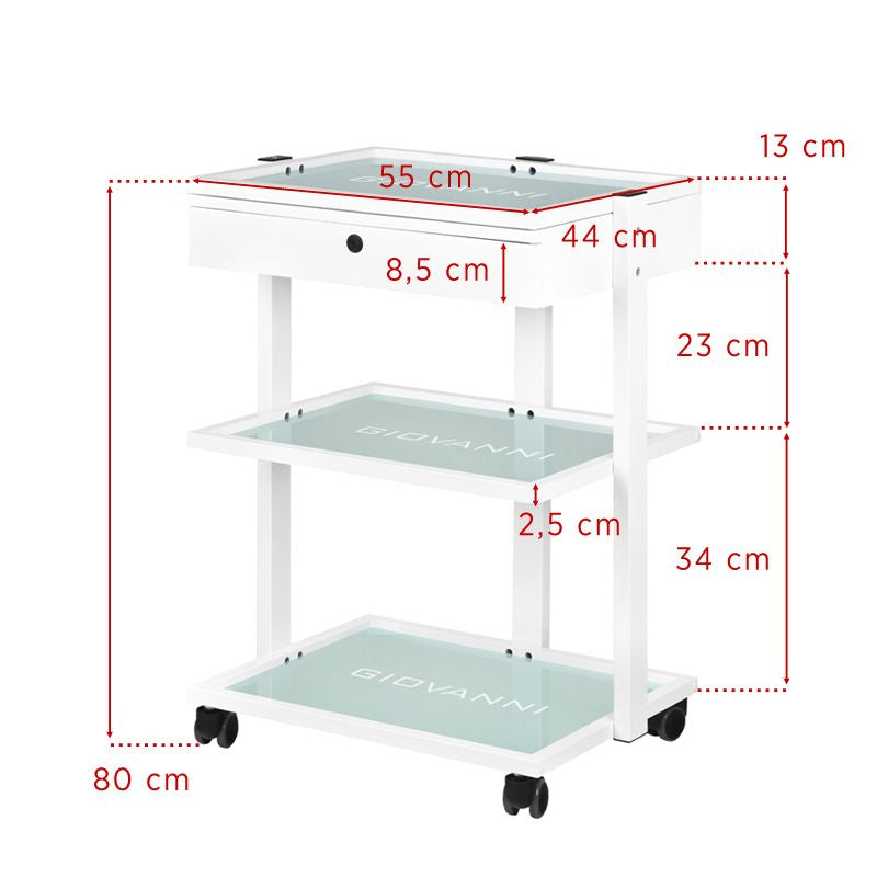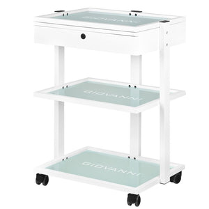 elegantan metalni i stakleni stol, na gumenim kotačima. stol ima prostranu ladicu i dvije staklene police s ugraviranim logotipom giovanni. moguće je pričvrstiti lampu-povećalo na stol.