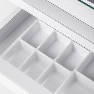 The narrow upper glass shelf allows for convenient storage of the most frequently used accessories. The cabinet is equipped with four drawers of various sizes, which facilitates the orderly storage of tools and cosmetic products. The mirrored bottom of one of the drawers and a dedicated internal organiser facilitate better organisation of tools, ensuring quick access to essential accessories and increasing comfort during treatments. The height of the upper open drawer allows you to place essential equipment, such as a nail drill with an absorber.