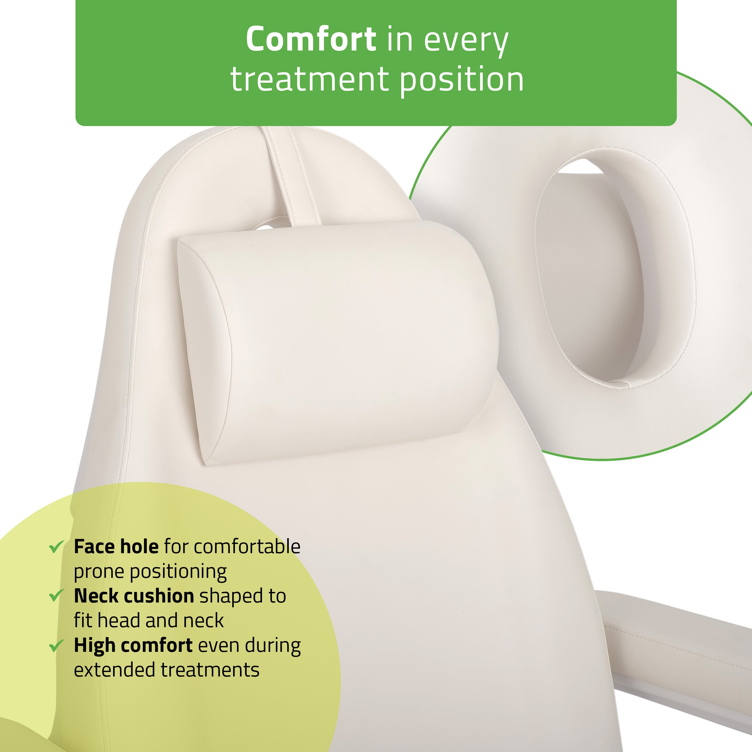 Soft neck cushion: ergonomically shaped to fit the contours of the head and neck, ensuring stable support and high comfort throughout the treatment