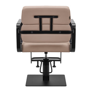 The full rotation mechanism of the chair makes the hairdresser's work more effective and comfortable. A solid, flat, square-shaped base guarantees stability during use. The matte-finished, smooth surface gives the element an elegant look and makes it easy to keep clean. A comfortable seat with foam filling ensures high comfort of use, even during many hours of treatments. Geometric, metal armrests allow for the correct positioning of the client's shoulders – this means that he does not bury his head in his shoulders or slouch – which makes it much easier to perform precise treatments, including haircuts. A stylish footrest dedicated to this model provides stable support for the user's feet.