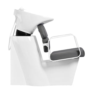 The practical hair wash unit is equipped with a mixer faucet, which provides easy access to hot and cold water. This makes it easier to adjust the temperature to the customer's individual preferences. A dedicated place to hang up the handset makes work easier, and the chrome-plated plug with a special strainer allows you to control the water flow and maintain high hygiene standards in the salon. The water connection has been placed inside the base, allowing the pipes to be easily hidden. A significant advantage of this model is the opening left between the backrest and the seat, which makes it easier to keep the living room clean by allowing you to easily sweep dirt from every nook and cranny of the chair. The hair wash unit has been designed in such a way as to ensure comfort during various treatments, ensuring proper back support. The combination of functionality and amenities makes working in a hairdressing salon even more comfortable.