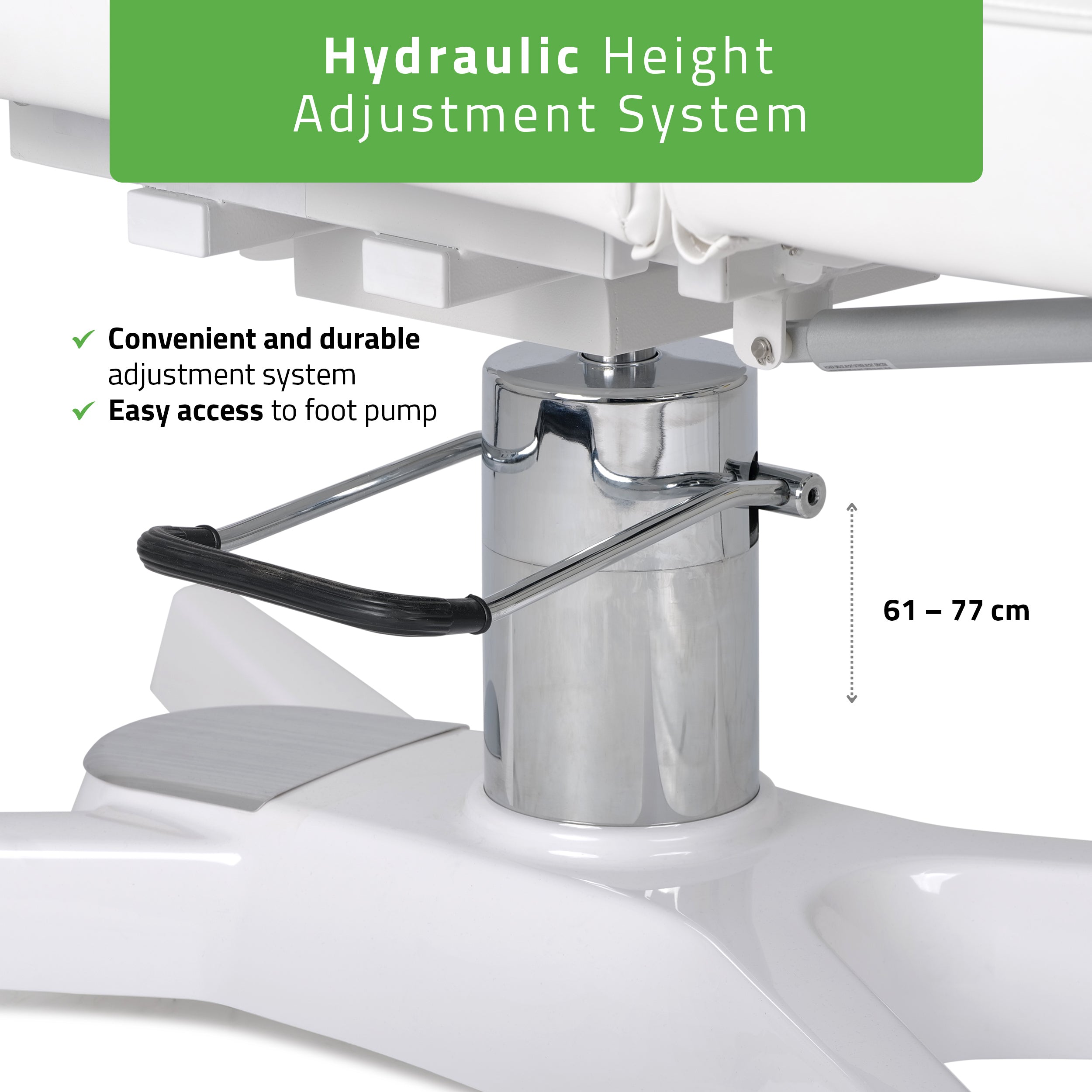 Height adjustment by hydraulic foot pump from 61 to 77 cm: smooth and stable adjustment without effort.