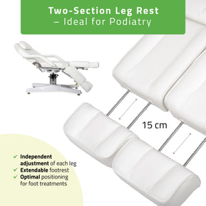 Extendable leg sections with separate adjustment for each section: ideal for podiatry treatments, enabling one leg to be raised independently.